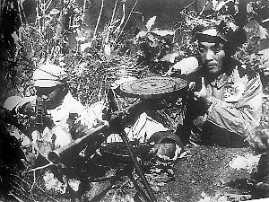 就在各級(jí)指揮員心急如焚地等待戰(zhàn)況匯報(bào)時(shí),戰(zhàn)斗一幕比一幕慘烈地在兩個(gè)高地展開(kāi)——機(jī)槍射臺(tái)被炸爛了,戰(zhàn)士陳治國(guó)用負(fù)傷的身體充當(dāng)射臺(tái)。孫子明4次負(fù)傷昏了過(guò)去,醒來(lái)時(shí)敵人已經(jīng)沖上了陣地,他握著3顆手榴彈沖入敵群……