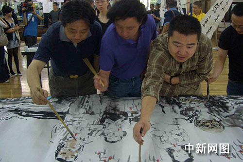 來(lái)自浙江畫院的池沙鴻等畫家共同完成向?yàn)?zāi)區(qū)遇難同胞表達(dá)哀思的作品。