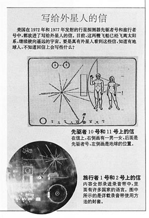 這種名片被認(rèn)為是一種與外星人進(jìn)行直接溝通的方法。在名片上,人類以圖畫的形式表示出了太陽系、地球所在的位置、男人和女人的形象。人們希望當(dāng)探測(cè)器在飛出太陽系后萬一被什么外星智慧拾獲,會(huì)發(fā)現(xiàn)我們的存在。