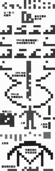 1974年11月16日下午,位于波多黎各的大型射電望遠(yuǎn)鏡向武仙座方向發(fā)送一個(gè)給外星人的信號(hào),這個(gè)信號(hào)持續(xù)3分鐘。信息中以符號(hào)的形式描述了1~10的數(shù)字、太陽系、地球和人類的DNA。這條信號(hào)以光速飛向25000光年以外的一個(gè)星團(tuán)。也就是說,假如那里有外星人收悉我們的信號(hào),然后再給我們作出回復(fù)的話,我們會(huì)在5萬年后收到它。