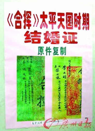 昨日,圓明新園內(nèi)華夏婚俗館正式開館,將向游客免費開放,其中光各式結(jié)婚證、訂婚證就有一百多件。記者現(xiàn)場看到,我國歷史上發(fā)現(xiàn)最早的結(jié)婚證書是太平天國時期的婚書《合揮》的復印件。