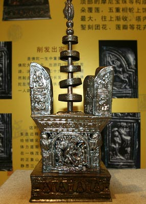 杭州西湖邊的雷峰塔,除了讓人聯(lián)想到白娘子和許仙的浪漫傳奇,那座2001年在地宮出土的銀制“阿育王塔”也是其重寶。但很多人不知道,“阿育王塔”還有一座“姊妹塔”——即天宮中的阿育王塔,因出土?xí)r破損嚴(yán)重,一直藏于文保部門。昨天,成功修復(fù)后的雷峰塔天宮銀質(zhì)鎏金阿育王塔首次與世人見面——浙江博物館專門進(jìn)行了《天覆地載——雷峰塔天宮阿育王塔特展》,展出五代吳越國(guó)王錢俶鑄造、歷代民間仿造的阿育王塔30余座,其中1級(jí)品10余件,為國(guó)內(nèi)首次對(duì)阿育王塔的集中展示。