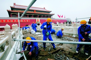 昨日下午2時(shí),天安門(mén)前金水橋東西兩側(cè)的“品級(jí)橋”橋頭,已設(shè)2米多高的青灰色圍擋。東側(cè)的“品級(jí)橋”上,20多名佩帶天安門(mén)管委會(huì)施工工作證的工人,手持鐵錘和鑿子席地而坐,一點(diǎn)點(diǎn)“開(kāi)墾”著橋面。據(jù)橋頭的安全員說(shuō),由于橋面空間較小,限制了進(jìn)場(chǎng)施工人員數(shù)量,工人已分為兩班晝夜施工,保障工期。