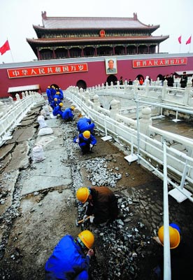 為迎接新中國(guó)成立60周年,天安門(mén)金水橋從昨日起開(kāi)始修繕。天安門(mén)管委會(huì)昨日消息稱,此項(xiàng)工程預(yù)計(jì)在5月1日前完工。來(lái)自北京市文物局官網(wǎng)的招標(biāo)公告顯示,工程財(cái)政撥款資金94.64萬(wàn)元。