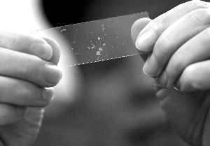 在辦公室中,潘彪教授小心翼翼地取出一個紙盒子,盒子上有“木材樹種取樣標本”的字樣。打開盒子,掀開一層棉花,幾塊玻片整齊地疊放在一起。湊近了看,記者才發(fā)現(xiàn)里面只有星星點點般的木屑,袖珍得可憐。“這就是取回來的樣品?”記者有些失望!笆前,就這些還花了幾個鐘頭才找到的呢。”潘彪捏緊兩片玻片,囑咐記者憋住呼吸,別把這些木屑吹散了。“你只要哈一口氣,就能把這些寶貝吹走!