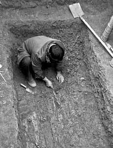 墓葬群位于南陽市八一路和文化路交叉口的東南角,現(xiàn)在是南陽市商貿(mào)中心的建設(shè)工地,共有50座墓葬在此,埋葬的是低級貴族或高等武士。去年12月,南陽市文物考古研究所在這里進行文物勘探時,發(fā)現(xiàn)了這些墓葬,并于今年1月8日開始發(fā)掘。