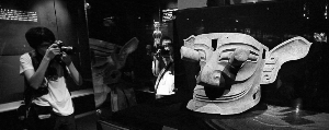 此次展覽集中了部分金沙遺址考古發(fā)掘的最新成果和最有代表性的精美文物,如金人面形器、鳥首魚紋金帶、四節(jié)玉琮、四出有領(lǐng)玉牙璧、刻紋石磬等。一件長(zhǎng)達(dá)1.8米的金沙象牙的重量以噸計(jì)。