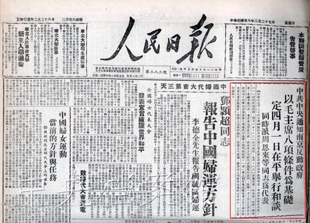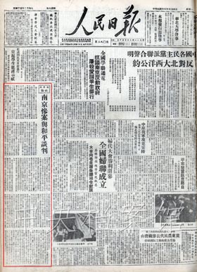 4月1日,由張治中、邵力子、黃紹竑、章士釗、李蒸、劉斐組成的南京國(guó)民黨政府談判代表團(tuán)到達(dá)北平,周恩來(lái)等設(shè)宴招待。以周恩來(lái)為首席代表,林伯渠、林彪、葉劍英、李維漢、聶榮臻為成員的中共代表團(tuán),開(kāi)始與國(guó)民黨代表團(tuán)舉行和平談判。4月15日,形成八條二十四款的《國(guó)內(nèi)和平協(xié)定》。但結(jié)果,南京政府拒絕接受協(xié)定,徹底暴露了假和平的真面目。