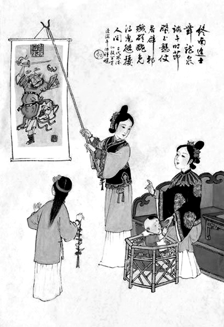 端午節(jié)期間,有些地方還流行居室中懸掛鐘馗像的習(xí)俗,據(jù)清代《北平風(fēng)俗類征》記載:“五月初一至初五為端陽節(jié),午時(shí)以朱墨畫鐘馗像,用雞血點(diǎn)眼,俗稱‘朱砂判’者懸屋中,謂能驅(qū)邪。”顧祿曾在他的《清嘉錄》中也有記述:“適逢端午,堂中掛鐘馗畫圖一月,以祛邪魅。”鐘馗乃唐朝有名畫家吳道子筆下的人物。據(jù)宋代《醉翁談錄》云:“除夜,舊傳唐明皇是夕夢(mèng)鬼物,名曰鐘馗,既覺,命工繪畫之。至今人家圖其形,貼于門壁。”相傳,唐明皇李隆基一次久病不愈,偶有一夜,夢(mèng)見一大鬼捉去一小鬼,大鬼聲稱自己名鐘馗,試武舉未中,誓為皇帝陛下除天下妖孽。唐明皇夢(mèng)醒,即刻病好。于是,便命吳道子將夢(mèng)中的鐘馗捉鬼作成一幅畫,掛于宮中以避邪和鎮(zhèn)妖。
