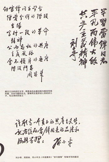 大約過(guò)了兩三天,《中國(guó)青年》雜志編輯部的同志打電話到毛主席辦公室,詢問(wèn)主席是否已經(jīng)答應(yīng)寫題詞。當(dāng)時(shí),我了解毛主席已經(jīng)看過(guò)《中國(guó)青年》雜志的信,但未作什么表示,我便如實(shí)地轉(zhuǎn)告。他們說(shuō),《中國(guó)青年》雜志在3月1日出版,能否請(qǐng)主席在2月25日前寫好,因?yàn)橛∷⑦需要一周的時(shí)間。我將他們的要求報(bào)告了毛主席。毛主席讓我先擬幾個(gè)題詞供他參考。我回辦公室,思索了一番,擬好了十來(lái)個(gè)題詞,立即送給他。我現(xiàn)在還可以回憶起幾個(gè)題詞的大致內(nèi)容。如:“學(xué)習(xí)雷鋒同志全心全意為人民服務(wù)的思想”、“學(xué)習(xí)雷鋒同志鮮明的階級(jí)立場(chǎng)”、“學(xué)習(xí)雷鋒同志艱苦樸素的作風(fēng)”、“學(xué)習(xí)雷鋒同志毫不利己專門利人的優(yōu)良品德”,“學(xué)習(xí)雷鋒同志勤奮好學(xué)的精神”等等。