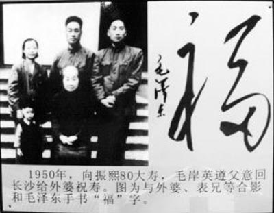 1950年,向振熙80大壽,毛岸英遵父意回長(zhǎng)沙給外婆祝壽。圖為其與外婆、表兄等合影和毛澤東手書“!弊。
