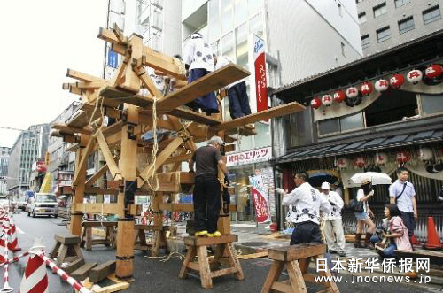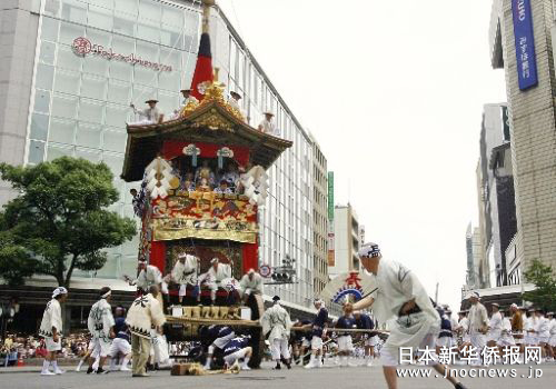 中新網(wǎng)7月19日電 據(jù)日本新華僑報報道,時值梅雨季節(jié),日本古城京都又迎來了一年一度的祗園祭的高潮。7月17日上午9時許,32輛用彩色織品裝飾的燦爛花轎彩車冒著牛毛細雨,沿著用竹片鋪就的街道,在京都市中心“花轎巡行”。 過程中最精彩的場面要數(shù)在四條河原町的“街口轉(zhuǎn)向”,10多噸重的彩車在十字路口來了個90度的轉(zhuǎn)身。當?shù)鼐用裨谲囕喯落仢M竹片并灑上水,彩車在“嘎吱嘎吱”的巨響中來回旋轉(zhuǎn),博得了現(xiàn)場人群的熱烈喝彩與掌聲。