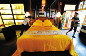 東長房觀眾服務(wù)區(qū),工作人員在整理故宮特色商品,僅有一套的云錦緙絲寢具(五件套)標(biāo)價888888元。與30元一碗的面相比,這套云錦緙絲寢具才是真正的天價。