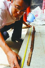 這次出土的幾件鐵器也引起了李銘的興趣。他告訴記者,別小看了這些鐵器,在漢代,這樣的鐵器屬于高檔品,不是一般人能用 的,更不是一般人能享受這樣的陪葬品的。這次出土的鐵器最重要的有3件。第一件是一柄鐵劍,已經(jīng)斷裂為5截,經(jīng)拼接后測量,其長大約1.15米。雖然劍體 銹蝕嚴重,但依然能看出質地優(yōu)良,制作講究。劍柄的造型還基本清晰,劍箍為青銅制作。從這柄劍上,我們可以推斷很多當時的情況,如劍長1.15米,比現(xiàn)在 一般的劍要長,這就說明使用這柄劍的人身材比較高大;根據(jù)劍的形制,可初步認定是濟南當?shù)刂谱,如果通過科技手段研究出劍的鐵質及其他合金含量,這對研究 漢代時期濟南地區(qū)的冶煉史有重要的參考價值。再說鐵鼎和鐵釜,它們都是漢代時期的生活用具。其中,鐵鼎為雙耳三足折腹鼎,形狀很好。雖然現(xiàn)在看銹蝕嚴重, 但在當時不是一般人家能夠使用的,不是官員,至少也是大戶人家,所以這對研究當時的社會生活和陪葬習俗都有重要價值。