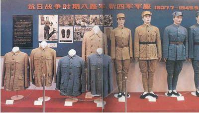 抗戰(zhàn)爆發(fā)后,紅軍改編為八路軍、新四軍,服裝、標(biāo)志基本與國民黨軍隊相同。八路軍、新四軍都佩戴“青天白日”帽徽,但臂章上卻清楚地標(biāo)明了自己的身份。八路軍佩戴“八路”長方形臂章,新四軍佩戴“新四軍”或“N4A”的臂章。八路軍的軍服顏色多為土黃色,新四軍多為灰色。