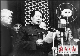 毛澤東主席神情肅穆。他邁著穩(wěn)健的步子走到麥克風(fēng)前,環(huán)視了一下廣場上沸騰的人群,平緩了一下呼吸,用他那濃重而激昂的湘音,莊嚴宣布: