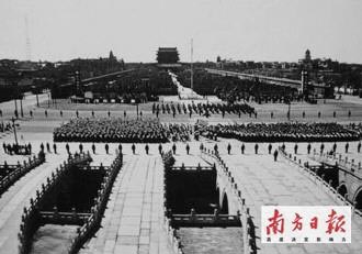 在《三大紀律八項注意》《軍隊和老百姓》《保衛(wèi)勝利果實》等軍樂的鳴奏中,朱德由聶榮臻陪同,同乘一輛敞篷車,出東三座門,沿著東長安街,緩緩駛過受閱的八十幾個方隊。一排排锃亮的綠色鋼盔下面,閃動著一雙雙敬仰、忠誠、親切的目光。