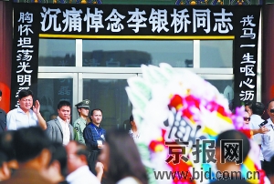 今天上午10時(shí),毛澤東衛(wèi)士長李銀橋追悼會(huì)在八寶山殯儀館舉行。李銀橋生前同事、友人和眾多滿懷對老人崇敬之情的市民參加了遺體告別儀式。李敏、毛新宇等毛澤東親屬也來到追悼會(huì)現(xiàn)場。