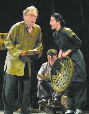 劇中另一個重要角色是宋丹丹扮演的頑強、善良、刀子嘴豆腐心的田翠蘭。住在西廂房的田翠蘭和她那木訥、厚道的丈夫王立本,苦苦地經(jīng)營著一個賣炒肝和窩頭的浮攤。她與住在東廂房的正骨醫(yī)生周立浦的妻子金穆蓉——一位落難背時的末代滿清格格,時不時針尖對麥芒地對掐。當過“暗門子”(暗娼)、歷經(jīng)各種生活磨難的田翠蘭,嘴皮子不饒人,卻不妨礙她勇于賣身救女和舍命給嗷嗷待哺的染有童子癆的苑江渺喂奶。較之《茶館》中的茶客,《窩頭會館》中的窮苦住戶,有更多的磕碰、抵牾,也有更多的依存與照應(yīng)。反復(fù)渲染的田翠蘭對苑大頭和他的兒子苑江渺的關(guān)切與照顧,在舞臺演出中被輕輕帶過的她對苑大頭的愛戀與通奸,以及王立本心明如鏡的寬容,不僅真實、真切地呈現(xiàn)了大雜院下層民眾鄙俗的生活態(tài)度與情感價值,也描摹了他們畸零的人生與無論在任何嚴酷的生存環(huán)境中從未泯滅的善良本性,發(fā)掘了那教化之外的倫理行為的人性內(nèi)涵與生命熱力。