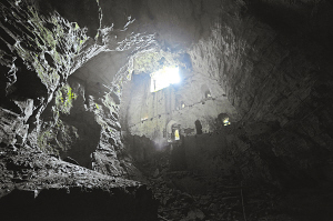 最吸引劉冬故地重游的是,洞內(nèi)除那個(gè)200多平方米的空間讓人無限暇想外,旁邊石壁開鑿、用于支撐木板建樓的石孔讓人嘆為觀止:石孔有30多個(gè),從洞壁這端呼應(yīng)另一端,跨度超過30米。如此遠(yuǎn)的距離,古時(shí)建樓常用的材料——木棒,是如何解決受力和加固等建筑難題的?劉想不明白,更無法得知當(dāng)時(shí)洞內(nèi)小樓模樣。