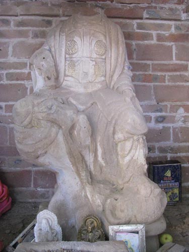 據(jù)國(guó)家文物局網(wǎng)站消息,該造像砂石圓雕,頭已殘失,高120厘米,寬65厘米,厚50厘米,坐于樹(shù)根狀座上,左腿自然下垂,跣足踏一類似玄武的物體,左手平置于左膝,右腿上屈置于座面上,右腳殘缺。坐姿類似于觀音的游戲坐,披發(fā)跣足,外著大衣,內(nèi)著鎧甲,胸部為人字形護(hù)心鏡,胸系絆帶,腰扎英雄巾。座后方刻凌亂文字?jǐn)?shù)行,大多已漫漶不可辨識(shí),依稀可見(jiàn)“神□七年”、“正大二□”等。