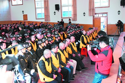 8時30分,庭審正式開始。宣布完法庭紀(jì)律后,審判長一聲令下:“傳被告人到庭!”緊接著,27名身著橘色背心的被告人被帶上法庭。被告人在魚貫而入時,均不時向旁聽席上張望,而旁聽席上也傳來一陣細(xì)細(xì)的抽泣聲。