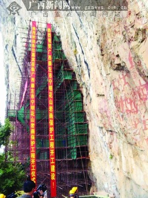 昨日上午,在簡(jiǎn)短而隆重的開工儀式后,廣西崇左市寧明花山巖畫保護(hù)工程正式開工。花山巖畫保護(hù)前期工作長(zhǎng)達(dá)18年,僅在方案研究、材料試驗(yàn)和方案設(shè)計(jì)等工作上就耗時(shí)5年,其所動(dòng)用的學(xué)科領(lǐng)域和專家之廣、所耗資金之多,不僅在廣西文物保護(hù)史上史無前例,就是在中國文物保護(hù)史上也極為罕見,而此次開工的第一期搶救性加固工程被專家稱為“要干救命的活”。那么等著“救命”的花山巖畫其病害危重到什么程度?為什么前期工作要花費(fèi)那么長(zhǎng)時(shí)間?一期保護(hù)工程將使用哪些先進(jìn)技術(shù)?我們以后還能不能看到它的原貌?記者在保護(hù)工程現(xiàn)場(chǎng)進(jìn)行了采訪。
