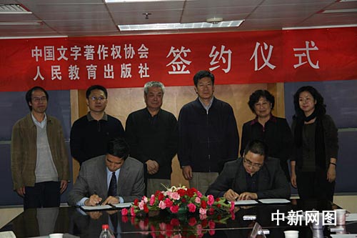 新聞出版總署副署長(zhǎng)、國(guó)家版權(quán)局副局長(zhǎng)閻曉宏,中國(guó)文字著作權(quán)協(xié)會(huì)會(huì)長(zhǎng)、中國(guó)作協(xié)副主席陳建功出席并致辭。中國(guó)文字著作權(quán)協(xié)會(huì)常務(wù)副總干事張洪波與人民教育出版社社長(zhǎng)李志軍代表雙方簽字。