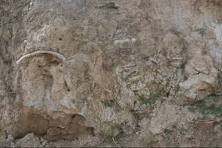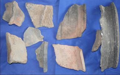 另在遺址東部的取土坑內(nèi)暴露一陶窯遺跡,陶窯開(kāi)口距地表1米,窯的剖面為半圓形,直徑2.3米,殘高0.8米,底部紅燒土厚4厘米,上部灰燒土厚3厘米,窯內(nèi)由磚塊、燒土塊,灰土、繩紋灰陶罐片等。地表散落有大量的遺物。