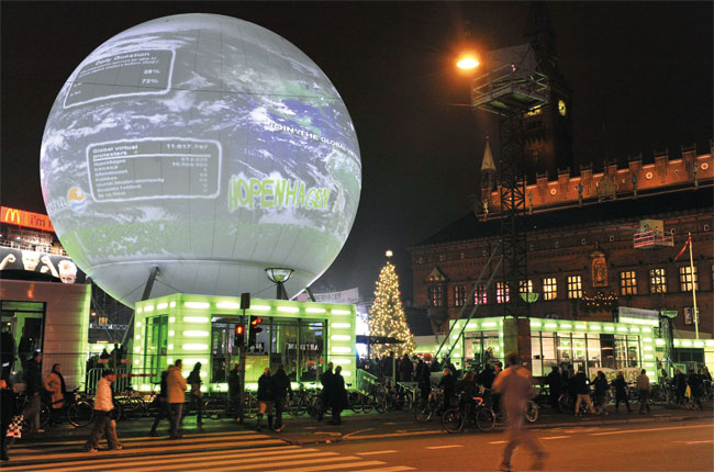 12 月7 日,記者抵達哥本哈根。據說,有大約1200 輛豪華汽車、140 架私人飛機以及數萬人涌入哥本哈根,為此,丹麥政府不得不為會議購買價值60 萬歐元的“碳積分”。中國和美國成為會場里最受關注的焦點。而在會場外,到處可見環(huán)保人士的環(huán)保秀,來自小島國代表的示威抗議也此起彼伏。此時,受人矚目的哥本哈根變成了一個環(huán)!按笮銏觥。