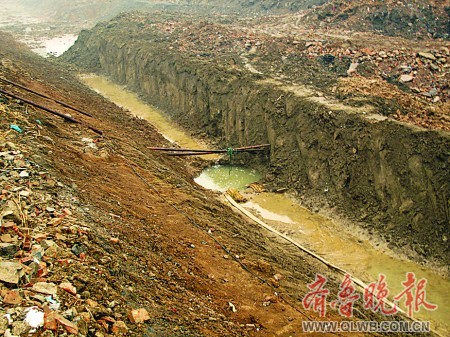 記者20日來到發(fā)現古墓的工地。因為下雨,工地中一片泥濘。這個剛被挖出的宋元古墓在一條東西走向的河溝溝底,距離地面約五六米,墓口用兩根棍子示意。起初,墓穴的外形還比較明顯,隨著河溝一側的雨水向墓穴匯去,幾十分鐘的工夫便被淹沒了。