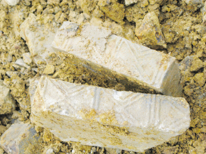 該工地位于高淳固城湖風景區(qū)西側(cè)的淳南路旁。記者踩著泥濘的土地,爬上東側(cè)一座小山丘。環(huán)顧地面,記者才發(fā)現(xiàn),腳下就是一座古墓,幾塊殘破的青磚隨地可見,再仔細輕輕地扒開松散的土層,只見一段帶有花紋的青磚排列著!澳銈冞^來看,這里有一個盜坑!彪S著專家手指的方向,記者看見了一個很大的盜坑,周邊土層上全是大大小小的探洞。記者跟隨考古人員發(fā)現(xiàn),位于這座古墓北面約四五米處又是一座古墓,已經(jīng)基本被鏟平,再往北,還有一座,也同樣毀壞慘重。
