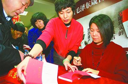 3點(diǎn)30分,簽售活動(dòng)正式開(kāi)始。人們按照順序,依次走到簽售臺(tái)前請(qǐng)孔東梅簽名,有的人還對(duì)其表達(dá)著對(duì)毛澤東的熱愛(ài)之情,有的則和她合影留念。