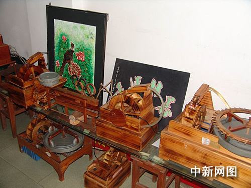 涂祖奕介紹,這些“活寶”名為“水驅(qū)仿古飾物”,是他經(jīng)多年時(shí)間,在繼承中國(guó)傳統(tǒng)農(nóng)業(yè)水利設(shè)施精華的基礎(chǔ)上,匠心獨(dú)運(yùn),按照一定的比例微縮精做而成,有微型水碓、水磨、輪碾、水鋸等5個(gè)系列40多個(gè)品種,均已獲國(guó)家專利證書。