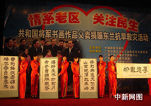 中新網(wǎng)南寧3月27日電(記者 羅先彬)2009年8月份以來(lái),廣西革命老區(qū)東蘭縣境內(nèi)持續(xù)干旱,人畜飲水困難,農(nóng)業(yè)生產(chǎn)受影響嚴(yán)重。東蘭縣嚴(yán)重的旱情,牽動(dòng)了一群遠(yuǎn)在北京的共和國(guó)老將軍的心:中共第十二屆至第十五屆中央委員、原沈陽(yáng)軍區(qū)、蘭州軍區(qū)司令員、軍事科學(xué)院院長(zhǎng)劉精松上將,和其他八位老將軍,不顧年高體弱,千里迢迢趕赴南寧,獻(xiàn)出自己精心創(chuàng)作的114幅書畫作品進(jìn)行慈善義賣,所得114萬(wàn)元全部捐給東蘭人民,用于目前的抗旱救災(zāi)。