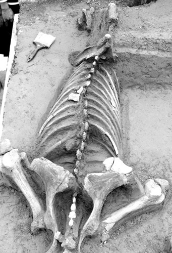 4月 12 日上午,高青陳莊遺址發(fā)掘?qū)<已杏憰谑〔┪镳^舉行,來自中國社科院、北京大學(xué)等單位的多位考古專家,對幾個(gè)月來的考古成果進(jìn)行了論證?脊湃藛T發(fā)現(xiàn)馬匹均呈“直立跪伏”狀,非常罕見。