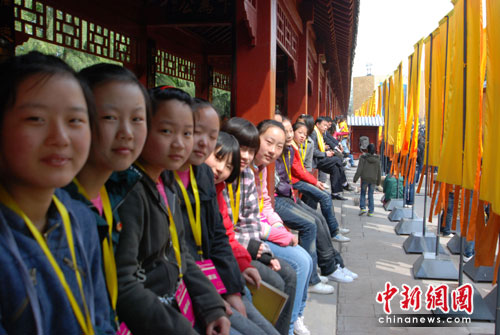 大典進(jìn)行時,各項準(zhǔn)備工作就緒,拜祖場務(wù)人員在拜祖現(xiàn)場等候各項議程的工作安排,他們“忙里偷閑”和中新網(wǎng)直播主持人合影留念。參加放飛和平鴿的兩岸四地的小朋友們靜靜坐在亭子里等候。