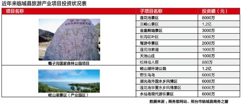 之所以這樣做,對(duì)兩地來(lái)講都有幾分無(wú)奈。臨城多年來(lái)苦于沒(méi)有一張城市的文化名片,該縣旅游資源豐富,崆山白云洞、天臺(tái)山、歧山湖、小天池、宋代普利寺塔 、唐代邢窯遺址。旅游產(chǎn)業(yè)初具規(guī)模,項(xiàng)目投資也很大(見(jiàn)附表),但是,一直缺乏自己的城市名片和旅游品牌,嚴(yán)重制約了當(dāng)?shù)芈糜螛I(yè)的大發(fā)展。