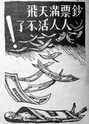 對(duì)于通貨膨脹,當(dāng)年老百姓曾這樣描述:國(guó)民黨政府發(fā)行的法幣,1937年100元可買到兩頭牛,1938年變?yōu)橐活^牛,1939年可買一頭豬,1941年能買到一袋面粉,1943年能買一只雞,1945年能買一個(gè)煤球,到了1948年,只能買到幾粒大米。