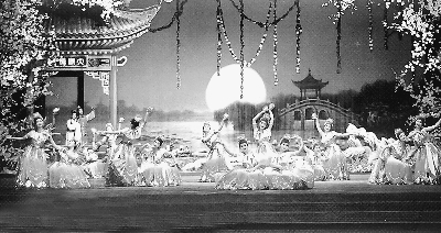 與朝鮮經(jīng)典歌劇《賣花姑娘》、《血海》等相比,新版歌劇《紅樓夢》更多地體現(xiàn)了朝鮮民族藝術(shù)的風(fēng)格特色。劇中歌曲大多采用朝鮮民謠的唱法,朗朗上口。無論是獨唱、伴唱,都吸收了朝鮮經(jīng)典歌劇的藝術(shù)特點,充滿濃郁的民族氣息。伴奏以民族器樂為主,輔以西洋配器,將寶黛愛情的純真和悲涼演繹得淋漓盡致。劇中有機穿插了三場舞蹈——“荷花舞”、“碟舞”和“彩綢舞”,成為朝鮮與中國傳統(tǒng)民族舞蹈的經(jīng)典展現(xiàn),尤其是月夜一場中的荷花舞,寶黛二人在花間穿梭,荷花仙子在蓮池中翩翩起舞,將觀眾帶入如夢如幻的人間仙境。