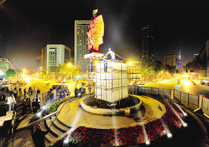 22:30,淮海路、洪武路、王府大街、長江路組成的新街口四環(huán)實(shí)施交通管制,新街口大轉(zhuǎn)盤馬上“清凈”下來。22:35,工作人員開始做吊裝前的準(zhǔn)備工作,首先是兩臺吊裝機(jī)駛近大轉(zhuǎn)盤南北向停放,緊接著工作人員將銅像下的原有基座切割掉后,吊機(jī)開始起吊銅像,為了平衡銅像,在銅像的四邊,都有人用繩子進(jìn)行牽拉,大約23:50銅像吊裝到基座上,工人開始對銅像進(jìn)行固定……截至記者發(fā)稿時(shí),銅像仍在安放中。