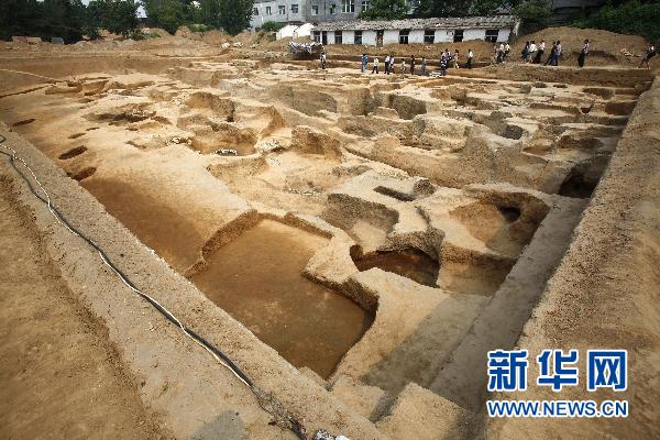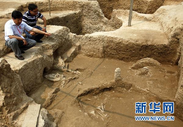 這是6月6日拍攝的洛陽市林校西周洛邑祭祀遺址的人馬組合坑。當日,河南洛陽市文物局組織專家對洛陽市林校西周洛邑祭祀遺址考古發(fā)現(xiàn)進行研討并向媒體發(fā)布了發(fā)掘成果。這處遺址西距瀍河約1公里,西北距北窯西周墓地及西周鑄銅遺址約4公里,總發(fā)掘面積為945平方米,于2009年2月開始發(fā)掘?脊湃藛T在洛陽市林校工地共發(fā)現(xiàn)西周灰坑59座、流水溝1條、墓葬14座以及唐代灰坑42座,其中31座西周祭祀坑的發(fā)現(xiàn)是本次發(fā)掘的重要收獲,為尋找西周洛邑城址提供了又一重要線索。新華社發(fā)(張曉理 攝)