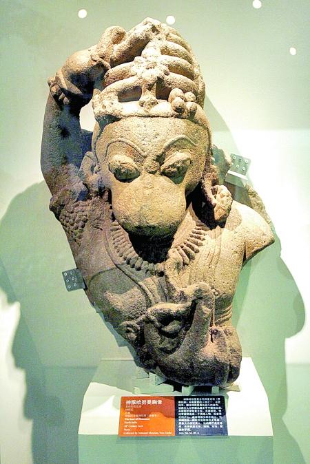 記者在2007年河南博物院舉辦的“西天諸神”展覽中見到過來(lái)自印度國(guó)家博物館的石質(zhì)“神猴哈奴曼胸像”(左圖)。這件神猴雕像雖然只存上半身,但形象確實(shí)酷似孫悟空。