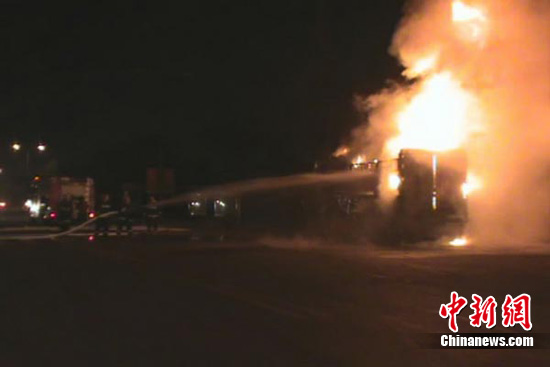 消防隊員趕到現(xiàn)場后,發(fā)現(xiàn)一輛廂式貨車大貨車正在燃起熊熊大火,10多米長的車廂已經(jīng)被大火包圍,火焰有四五米高。由于車上裝滿了摩托車,有的摩托車油箱里還有汽油,貨車隨時會有爆炸的危險。