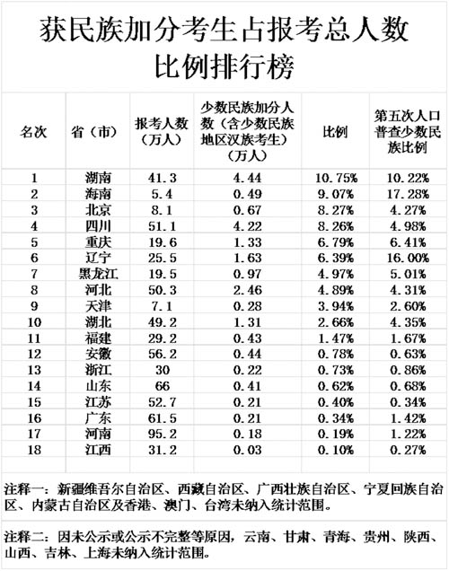 陜西省由于取消了二級(jí)運(yùn)動(dòng)員加分,獲加分人數(shù)也少得可憐。雖然記者沒(méi)能找到該省少數(shù)民族獲得加分的人數(shù),但其他所有加分項(xiàng)目的總?cè)藬?shù)才118人,占所有參加高考的378556考生的0.031%。