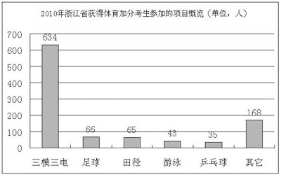 統(tǒng)計(jì)還發(fā)現(xiàn),田徑、籃球、足球三項(xiàng)加分考生在各地市分布比較平均,而健美操、無線電測(cè)向和定向越野卻集中在成都、綿陽和南充3市,共為500人,占這三項(xiàng)加分總?cè)藬?shù)的78%。