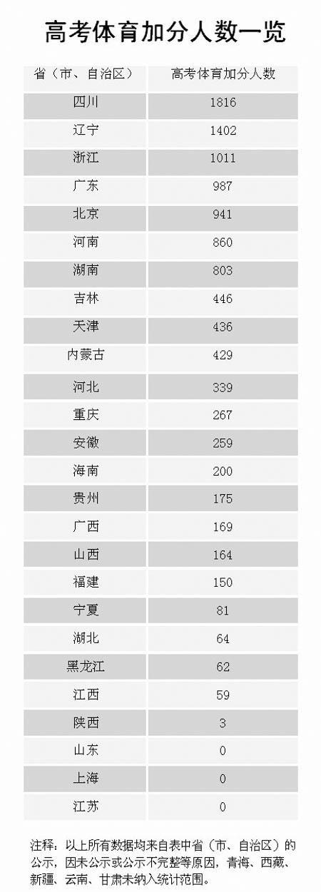 很多省份對(duì)體育加分項(xiàng)目并沒有做出詳細(xì)說明,如福建、吉林,只標(biāo)明了“經(jīng)省教育廳、體育局認(rèn)定的國(guó)家二級(jí)以上運(yùn)動(dòng)員”;天津、新疆也未明晰具體體育項(xiàng)目。貴州和河南也只是簡(jiǎn)單地區(qū)分了“重大體育比賽”及“國(guó)家二級(jí)運(yùn)動(dòng)員(含)以上”。 實(shí)習(xí)生 周薇
