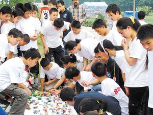 漂亮的別墅、美麗的天使、威武的坦克……各式各樣的小玩具被心理救援隊(duì)員們一字?jǐn)[開(kāi)。“每人挑一個(gè)喜歡的,然后坐到沙盤邊來(lái),聽(tīng)我給你們講故事好不好?”復(fù)旦大學(xué)心理學(xué)教授申荷永招呼著。很快,每個(gè)沙盤邊就圍坐了七八個(gè)學(xué)生!澳銥槭裁匆x房子模型呢?”“我家的房子被震壞了,希望能有一幢堅(jiān)固的房子……”心理援助就以這樣問(wèn)答的方式展開(kāi)。通過(guò)這樣挑選玩具后自由表達(dá)心聲的方法,能讓孩子逐漸擺脫對(duì)地震的恐懼感,大膽說(shuō)出自己的想法和愿望。