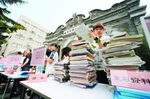 “眼看就要高考了,聽(tīng)說(shuō)他們連課本都沒(méi)有!薄拔业母呖冀Y(jié)束了,我想我的資料能對(duì)他們?cè)诟呖贾锌汲龊贸煽?jī)提供幫助!弊蛉丈衔9時(shí),剛剛結(jié)束高考的北京高三學(xué)生們?cè)诙行iT(mén)外將自己的復(fù)習(xí)資料捐贈(zèng)給災(zāi)區(qū),他們還將自己的祝福寫(xiě)在復(fù)習(xí)資料的扉頁(yè)上,向經(jīng)受地震災(zāi)害的同齡人送去鼓勵(lì)。
