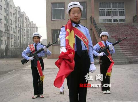 “拿美式槍,護咱的旗,咋看咋別扭!”23日晚上,網友“鍋爐工”在紅網論壇發(fā)帖爆料,稱在網易論壇、鐵血社區(qū)及貓撲大雜燴等網上看到一張雷人圖片:三小學生身穿交警服,其中兩名手拿M16自動步槍護旗。按說這應是仿真槍,可學校如此 ‘推陳出新’真把俺給嚇到了。不過,也有網友認為可能是有人擺拍的惡作劇,或表演什么的。